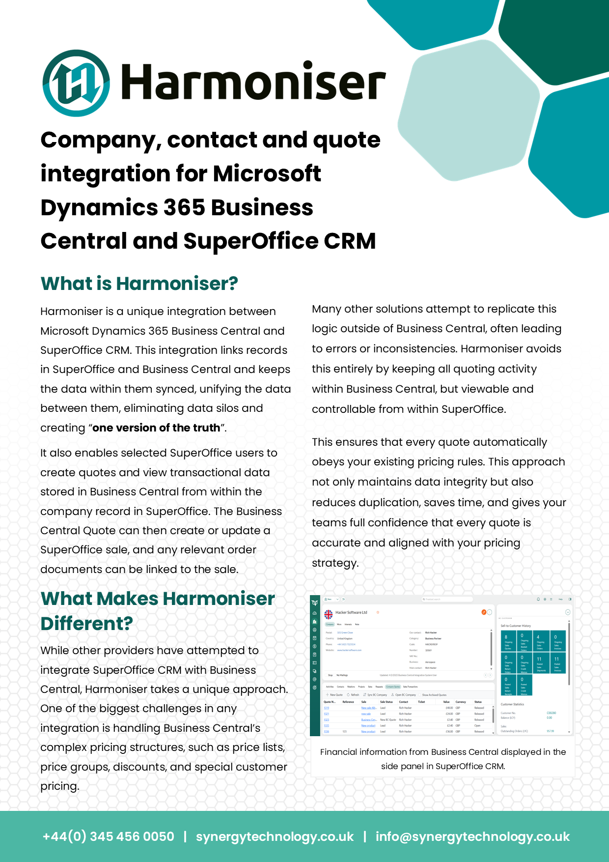 Harmoniser is a unique integration developed by Synergy Technology that seamlessly connects Microsoft Dynamics 365 Business Central with various CRM systems including SuperOffice CRM and Microsoft Dynamics 365 Sales.